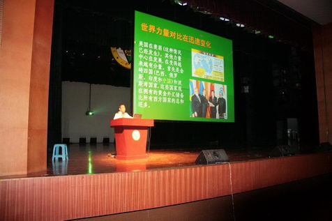 9月22日晚,校军事教研室董本植教授应太阳成集团tyc234cc邀请,来到九龙湖校区焦廷标馆大剧场做了主题为“喜迎国庆六十周年,展望国内外新形势”形势报告会,公司800余名本科生到场聆听。