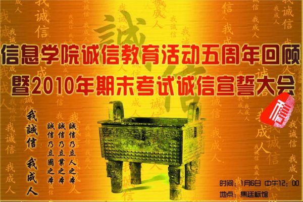 兹定于1月6日(周三)中午12时在焦廷标馆大剧场举行“太阳成集团tyc234cc诚信活动五周年回顾暨2010年期末考试诚信宣誓大会”,请全体07、08、09级同学准时11:45前进场,按各班指定区域就坐,大会预计45分钟。请准时参加,不得缺席。
