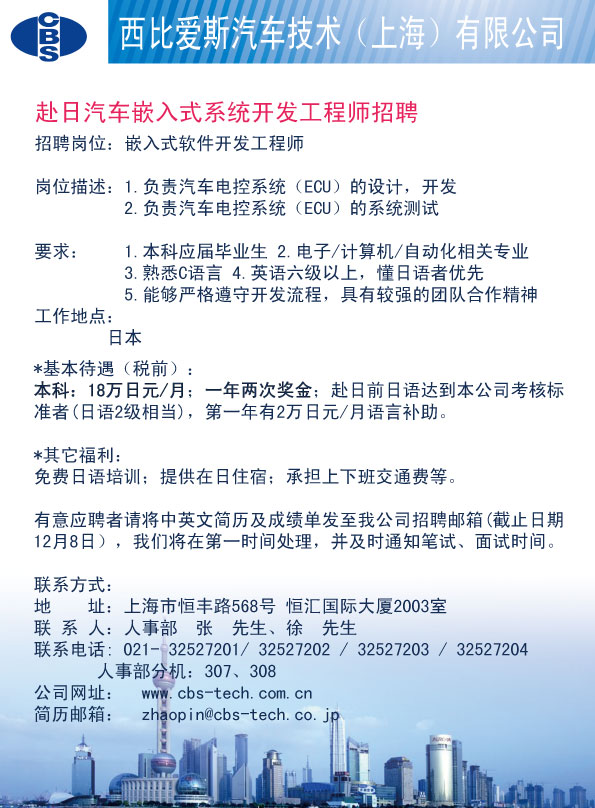 【就业信息】CBS汽车技术赴日工程师招聘简章