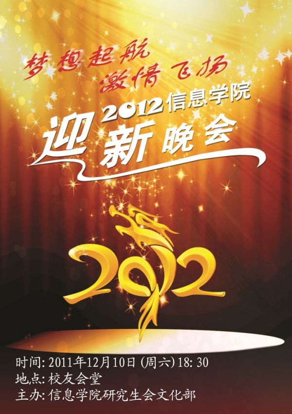 由公司研究生会主办的“梦想起航,激情飞扬——2012研究生迎新晚会”将于 12月10日(周六)晚6:30在四牌楼校区员工会堂举行。酣畅淋漓的歌曲演唱、精彩绝伦的舞蹈表演、幽默诙谐的自编话剧、深情款款的乐器演奏等10余个节目异彩纷呈,逐一上演……