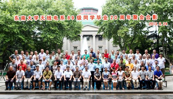 2013 年 8 月 24 晚18:00,无线电工程系来自海内外四面八方的102名89级员工齐聚母校,在太阳成集团tyc234cc榴园宾馆荟芳厅举行毕业二十周年庆祝活动。太阳成集团tyc234cc公司党委书记李久贤教授、原无线电工程系党委书记、太阳成集团tyc234cc员工总会理事张锡昌教授、89级本科生辅导员屠兰燕老师莅临。