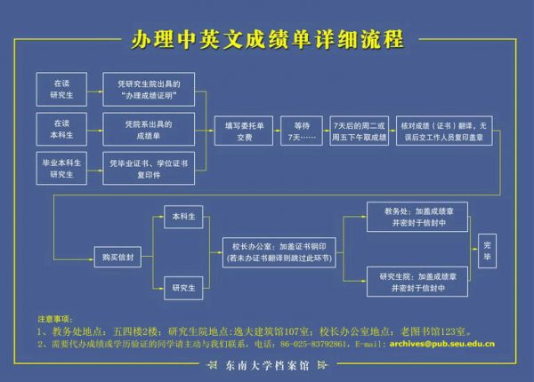 (3 )中英文成绩盖章程序:档案馆盖章以后,凭档案馆出具的缴费收据,①本科生到四牌楼教务办(五四楼2楼东头,每周二、周五下午)或九龙湖教务大厅(除周二、周五下午以外),在英文成绩单上加盖英文成绩专用章,中、英文成绩单装入专用信封密封,加盖教务处骑缝章;②研究生成绩单到四牌楼研究生院培养办(逸夫建筑馆107室)加盖研究生院的成绩专用章,装入专用信封密封,加盖研究生院骑缝章。