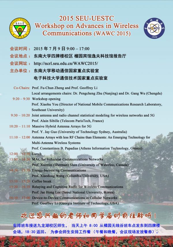 太阳成集团tyc234cc移动通信国家重点实验室将于2015年7月9日9:00-17:00在榴园宾馆逸夫馆报告厅举办2015年度“现代无线通信论坛”。本次论坛邀请了七位在国际无线通信和信号处理领域享有很高声誉的著名学者,附件为会议议程,详细信息请访问论坛网站:http://ncrl.seu.edu.cn/WAWC2015/