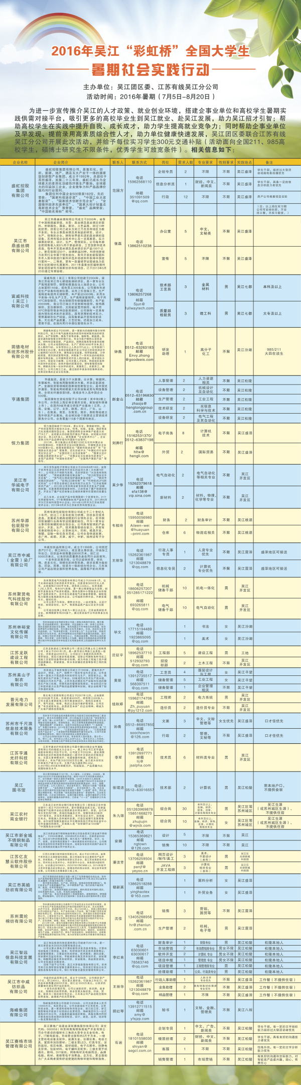 俗话说的好,“上有天堂,下有苏杭,苏杭中间是吴江。”为了进一步宣传推介吴江的人才政策、就业创业环境,搭建企事业单位和高校员工暑期实践供需对接平台,吸引更多的高校毕业生到吴江就业、赴吴江发展,助力吴江招才引智;帮助高校员工在实践中提升自我、成长成才,助力员工提高就业竞争力;同时帮助企事业单位及早发现、提前录用高素质综合性人才,助力单位健康快速发展,吴江团区委联合江苏有线吴江分公司举办了2016年吴江“彩虹桥”全国老员工暑期社会实践行动。吴江青联、青商以及相关企事业单位提供200余个实践岗位,吴江团区委为每位员工提供300元的交通补贴。“江南何处好,乐居在吴江”,我们在这里真诚期待您的到来。详情关注吴江团区委网站。
