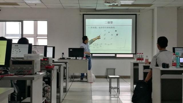 下午,在公司实验中心内,王欢副教授为同学们讲授了二极管、三极管知识,模拟放大器的工作原理和测试仪器使用,之后同学们两人一组,开展设计和制作,并用示波器进行调试。虽然大部分同学未使用过数字示波器、信号源等仪器,也没有理论知识基础,但现场气氛热烈,通过王老师的课堂指导及同学们的积极互动,实验取得了较好结果。