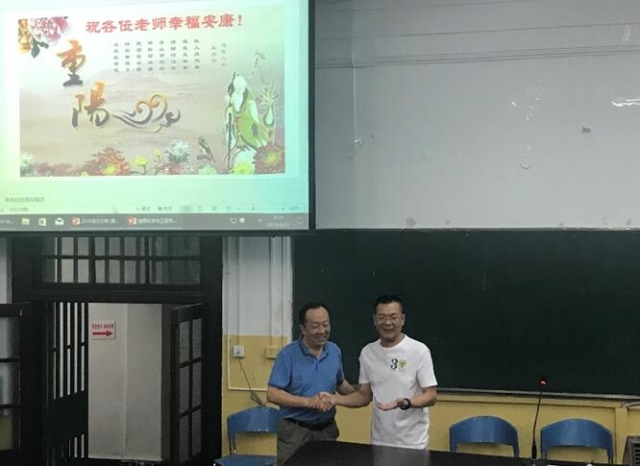 焦圣伟员工上台讲述了老师们当年辛勤工作的往事,对老师们的栽培指导表示感谢,满怀深情的为老教师们朗诵了一首《采桑子·重阳》。公司1986届全体员工感恩老教师们的培养,在2016年毕业三十周年返校聚会之际以年级名义特别设立了助教金,每逢重阳节向全体老教师送上慰问金。濮学禹上台代表老教师接受慰问并发言。