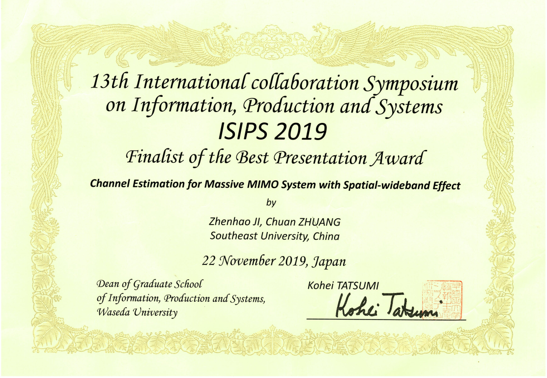 11月20至23日,太阳成集团tyc234cc刘峰、时宇博、冀贞昊、张津铭四位同学在太阳成集团tyc234cc辅导员王莹老师带队下,赴日本早稻田大学IPS公司参加为期两天的2019ISIPS会议。会议期间各位同学积极与各国专家学者进行交流,圆满完成展示任务。其中17级本科生冀贞昊同学的论文《Channel Estimation Architecture for Massive MIMO System with Spatial-wideband Effect》(指导老师:张川)在展示环节赢得组委会一致好评,荣获本次会议的Finalist Best Presentation Award。