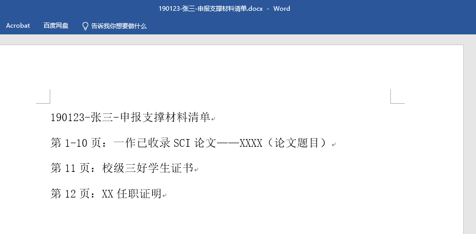1)将申报支撑材料整理成一个完整pdf,总结出目录,在封面页word文件(宋体,四号)内体现,对支撑材料分页数列举对应成果,例如:第1-10页:一作已收录SCI论文——论文题目,首行标题为:学号-姓名-申报支撑材料清单(如申请破格请标注),并附在支撑材料首页;