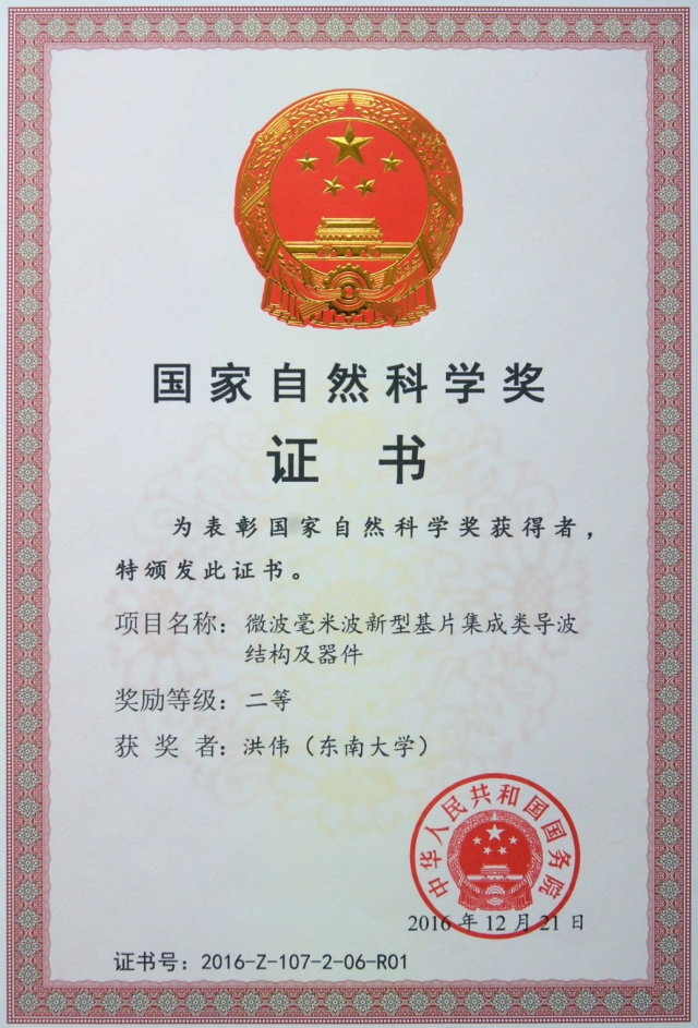2)基片集成类导波结构是近十几年来微波毫米波学界发展起来的一种新型高性能平面集成导波结构,它具有极低的电磁泄露和互扰,其品质因数和功率容量远高于传统平面传输线,国内外数百所大学和研究机构开展了大量研究,使之成为微波毫米波领域最受关注的研究分支之一。学科洪伟教授课题组是国际上这一学术分支的主要倡导者和贡献者之一,在IEEE系列刊物上发表学术论文120余篇,在美、英、德、日、韩、波、葡等国家召开的国际会议上作大会报告、特邀报告20余次,论文被40多个国家的学者正面他引5000余次,获授权国家发明专利50余项。研究成果在国内外都产生了比较大的影响,获2016年度国家自然科学二等奖。